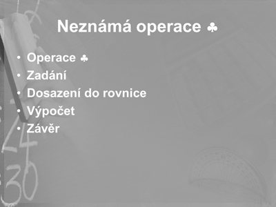 Operace $\clubsuit$ je speciální operace, kterou neumíme určit. Jednoduše nám udává jakýsi neznámý vztah mezi dvěma neznámými. Tento vztah však pro řešení rovnic s neznámou operací $\clubsuit$ nemusíme znát z toho důvodu, že v zadání již máme tento vztah vyčíslen přesnou hodnotou. Jedná se tedy o speciální typ rovnice, která se řeší pomocí dosazení jedné rovnice do druhé. Co máme tedy zadáno? Zadány jsou vždy dvě rovnice – jedna, která obsahuje dvě a více neznámých, mezi kterými existuje neznámá operace $\clubsuit$ a je vyjádřena jakýmsi vztahem mezi těmito dvěma neznámými. Druhá rovnice definuje přesnou hodnotu, které se rovná vztah s neznámou operací $\clubsuit$. Pro výpočet potřebujeme mít zadány hodnoty tolika neznámých, abychom po dosazení získali pouze rovnici o jedné neznámé. Platí tedy: jestliže první rovnice obsahuje například čtyři neznámé, potřebuji znát přesné hodnoty nebo aspoň vztahy tří z těchto neznámých. Jedno z možných zadání může vypadat například takto: Platí $x \clubsuit y = x \cdot y -2x$ Jestliže $x=5$ a $x \clubsuit y=30$, jaké hodnotě se rovná neznámá $y$? Zde vidíme zadání první rovnice vztahem, druhou rovnici definující přesnou hodnotu neznámé operace a zadání přesné hodnoty jedné ze dvou neznámých. Toto nám stačí k~tomu, abychom vypočetli, jaké hodnotě se rovná neznámá $y$. Budeme tedy postupovat tak, že dosadíme hodnotu rovnající se neznámé operaci do rovnice, která je zadaná vztahem. Získáme tedy $30=x \cdot y -2x$. Pro výpočet této rovnice potřebujeme znát hodnotu jedné neznámé. My známe hodnotu neznámé $x=5$ . Nahradíme tedy neznámou $x$ číslem $5$: $${5 : 30 = x \cdot y - 2x \Rightarrow 30 = 5 \cdot y - 2 \cdot 5 \Rightarrow 30=5y-10}$$ Tuto rovnici již umíme řešit, neboť se jedná o lineární rovnici o jedné neznámé. Rovnici tedy pomocí nám již známého postupu vyřešíme: $${30=5y-10 \Rightarrow 5y=30+10 \Rightarrow}$$ $${5y=40 / : 5 \Rightarrow y=8}$$ Získali jsme tedy hodnotu, které se rovná neznámá $y$ a tím jsme dospěli k závěru, že pokud je hodnota $x \clubsuit y =30$ a hodnota neznámé $x=5$, pak je hodnota druhé neznámé $y=8$. |