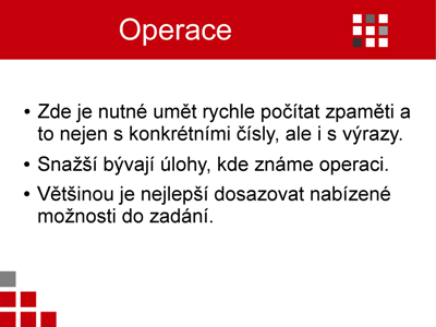 Jak jsme viděli ve cvičných příkladech, v těchto úlohách musíme provádět mnoho matematických operací, které ale nejsou příliš složité. Proto je velmi důležité umět počítat rychle a to nejen s konkrétními čísly, ale především s neurčitými výrazy a neznámými čísly. Viděli jsme, že nejjednodušší bývají úlohy, kde máme zadanou novou operaci a do ní jen dosazujeme nabízené možnosti, v těchto úlohách je také méně příležitostí k chybám, než v úlohách, kde musíme operaci hádat. Téměř všechny úlohy s operacemi lze řešit dosazováním. Některé úlohy dokonce není možné vyřešit obecně, protože mají více řešení. Dosazování bývá také nejrychlejší způsob řešení. |