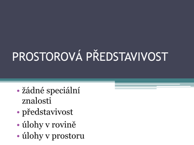 | * Prostorová představivost I. Je vhodné se nejprve podívat na všech 10 úloh a začít těmi, které lze vyřešit v rovině. Prostorová představivost se dá cvičením zlepšit, je proto užitečné procházet si úlohy z minulých ročníků TSP. Na následujících slidech si ukážeme nejtypičtější úlohy a způsoby jejich řešení. Nejprve se zaměříme na úlohy v rovině. | Přeskočit: Osobní menuPřeskočit: Informační doložka Informační doložkaMasarykova univerzita nabízí uchazečům o studium zdarma stažení všech dosavadních variant TSP i s klíčem správných odpovědí, včetně e-learningového kurzu, na adrese http://muni.cz/tsp, kde mohou uchazeči o studium rovněž nalézt odkazy i na další služby poskytované Masarykovou univerzitou - Diskusní fórum pro uchazeče, Interaktivní online TSP, Často kladené dotazy, aj. - (pozn. lektora: prosím studenty, aby toho využívali!)