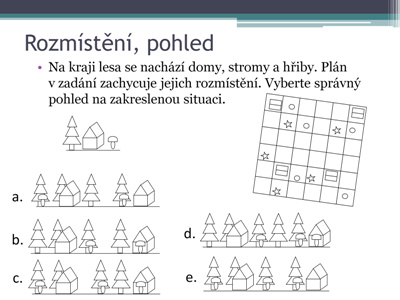 | * Prostorová představivost I. Pohled nemohl být zcela jistě pořízen ani zepředu, ani zezadu, protože v možnostech vidíme čelní stěnu domu. Kdybychom se na plán dívali zepředu nebo zezadu, viděli bychom boční stěnu. (čára značící hřeben střechy) Zbývá tedy pohled zprava nebo zleva, pravděpodobnější je pohled zprava, protože v možnostech se třikrát objevuje mezera na 4. místě. To ovšem nevylučuje pohled zleva. Pokud tedy, nenajdete žádnou možnost, která by vyhovovala pohledu zprava, přejděte k ověření pohledu zleva. Když se podíváme na objekty na plánu zprava, v první řadě je hřib a za ním strom, zpoza hřibu bude tedy vidět strom ![]() Ve druhé řadě je nejvíce v popředí dům, za ním je strom, který budeme taky zpoza domu vidět. Dále hřib, který je celý překryt a nejdále je opět dům, ten je rovněž překryt a to domem v popředí. Uvidíme tedy ![]() Ve třetí řadě je pouze strom. Uvidíme tedy ![]() Tato úloha koresponduje s úlohou rozmístění na www.muni.cz. | Přeskočit: Osobní menuPřeskočit: Informační doložka Informační doložkaMasarykova univerzita nabízí uchazečům o studium zdarma stažení všech dosavadních variant TSP i s klíčem správných odpovědí, včetně e-learningového kurzu, na adrese http://muni.cz/tsp, kde mohou uchazeči o studium rovněž nalézt odkazy i na další služby poskytované Masarykovou univerzitou - Diskusní fórum pro uchazeče, Interaktivní online TSP, Často kladené dotazy, aj. - (pozn. lektora: prosím studenty, aby toho využívali!)