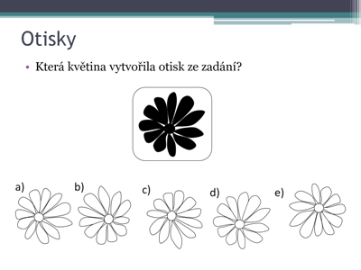 | * Prostorová představivost I. Všechny květiny jsou otočeny, žádná není překlopena. Květinu v duchu otočte do stejné polohy jako je otisk a pozorně porovnávejte jednotlivé lístky. Otisk i předloha musí mít tvar i pořadí lístků naprosto shodné. Lístky se mohou lišit délkou, šířkou nebo můžou být naprosto odlišně tvarované. ![]() Tato úloha koresponduje s úlohou Klíč 1 na www.muni.cz. | Přeskočit: Osobní menuPřeskočit: Informační doložka Informační doložkaMasarykova univerzita nabízí uchazečům o studium zdarma stažení všech dosavadních variant TSP i s klíčem správných odpovědí, včetně e-learningového kurzu, na adrese http://muni.cz/tsp, kde mohou uchazeči o studium rovněž nalézt odkazy i na další služby poskytované Masarykovou univerzitou - Diskusní fórum pro uchazeče, Interaktivní online TSP, Často kladené dotazy, aj. - (pozn. lektora: prosím studenty, aby toho využívali!)