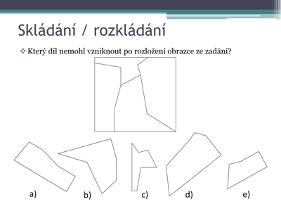 | * Prostorová představivost I. Jediný díl e) se nikde v zadání neobjevuje. | Přeskočit: Osobní menuPřeskočit: Informační doložka Informační doložkaMasarykova univerzita nabízí uchazečům o studium zdarma stažení všech dosavadních variant TSP i s klíčem správných odpovědí, včetně e-learningového kurzu, na adrese http://muni.cz/tsp, kde mohou uchazeči o studium rovněž nalézt odkazy i na další služby poskytované Masarykovou univerzitou - Diskusní fórum pro uchazeče, Interaktivní online TSP, Často kladené dotazy, aj. - (pozn. lektora: prosím studenty, aby toho využívali!)