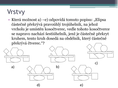 | * Prostorová představivost I. Elipsa částečně překrývá pravoúhlý trojúhelník,… nesplňuje c). Elipsa je za trojúhelníkem. Trojúhelník překrývá elipsu, ne elipsa trojúhelník. Na jehož vrcholu je umístěn kosočtverec,… nesplňuje b). Kosočtverec je nad trojúhelníkem, aby byl na trojúhelníku, musel by se ho dotýkat. Vedle tohoto kosočtverce se napravo nachází šestiúhelník,… Splňují všechny zbývající možnosti, jenž je částečně překryt kruhem,… nesplňuje d). Kruh a šestiúhelník jsou vedle sebe, nemůžou se proto překrývat. Tento kruh dosedá na obdélník,… Splňují všechny zbývající možnosti, který částečně překrývá čtverec... nesplňuje e). Čtverec překrývá obdélník, ne obdélník čtverec. Správná odpověď je a). Tato úloha koresponduje s úlohou Vrstvy na www.muni.cz. | Přeskočit: Osobní menuPřeskočit: Informační doložka Informační doložkaMasarykova univerzita nabízí uchazečům o studium zdarma stažení všech dosavadních variant TSP i s klíčem správných odpovědí, včetně e-learningového kurzu, na adrese http://muni.cz/tsp, kde mohou uchazeči o studium rovněž nalézt odkazy i na další služby poskytované Masarykovou univerzitou - Diskusní fórum pro uchazeče, Interaktivní online TSP, Často kladené dotazy, aj. - (pozn. lektora: prosím studenty, aby toho využívali!)